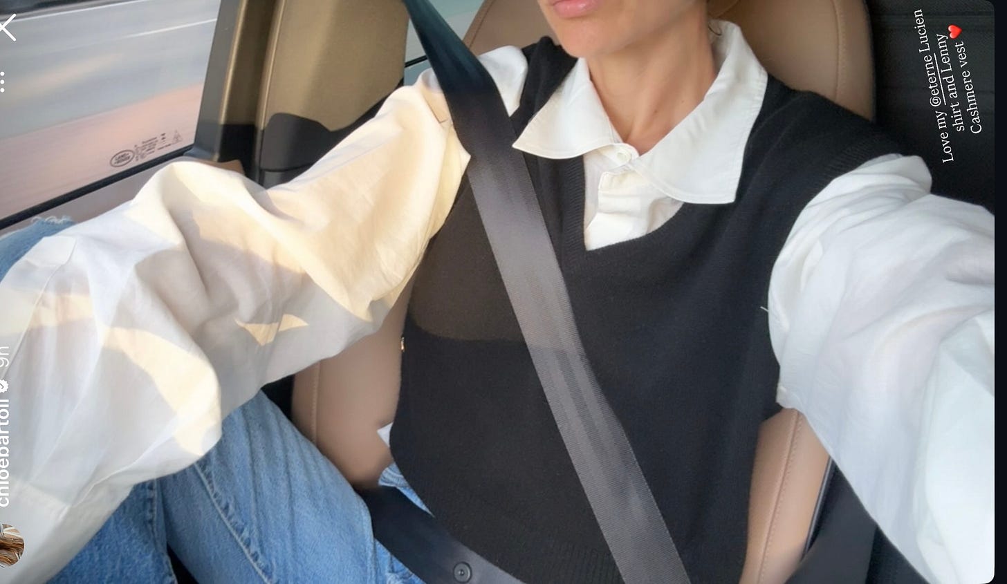 A screenshot from Eterne’s founder, Chloe Bartoli’s, Instagram. I have heard amazing things about Eterne sweatpants and I love this cashmere vest. Here’s one for less on Poshmark.