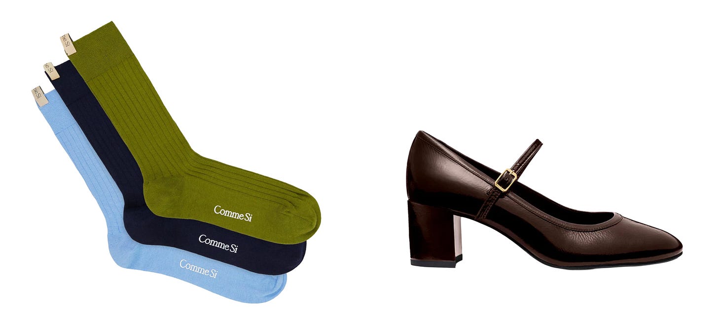 I am about to pull the trigger on these Comme Si socks to pair with my new Margaux heels (currently on sale). I think the blue would very cute.